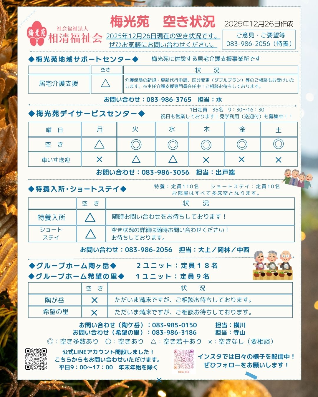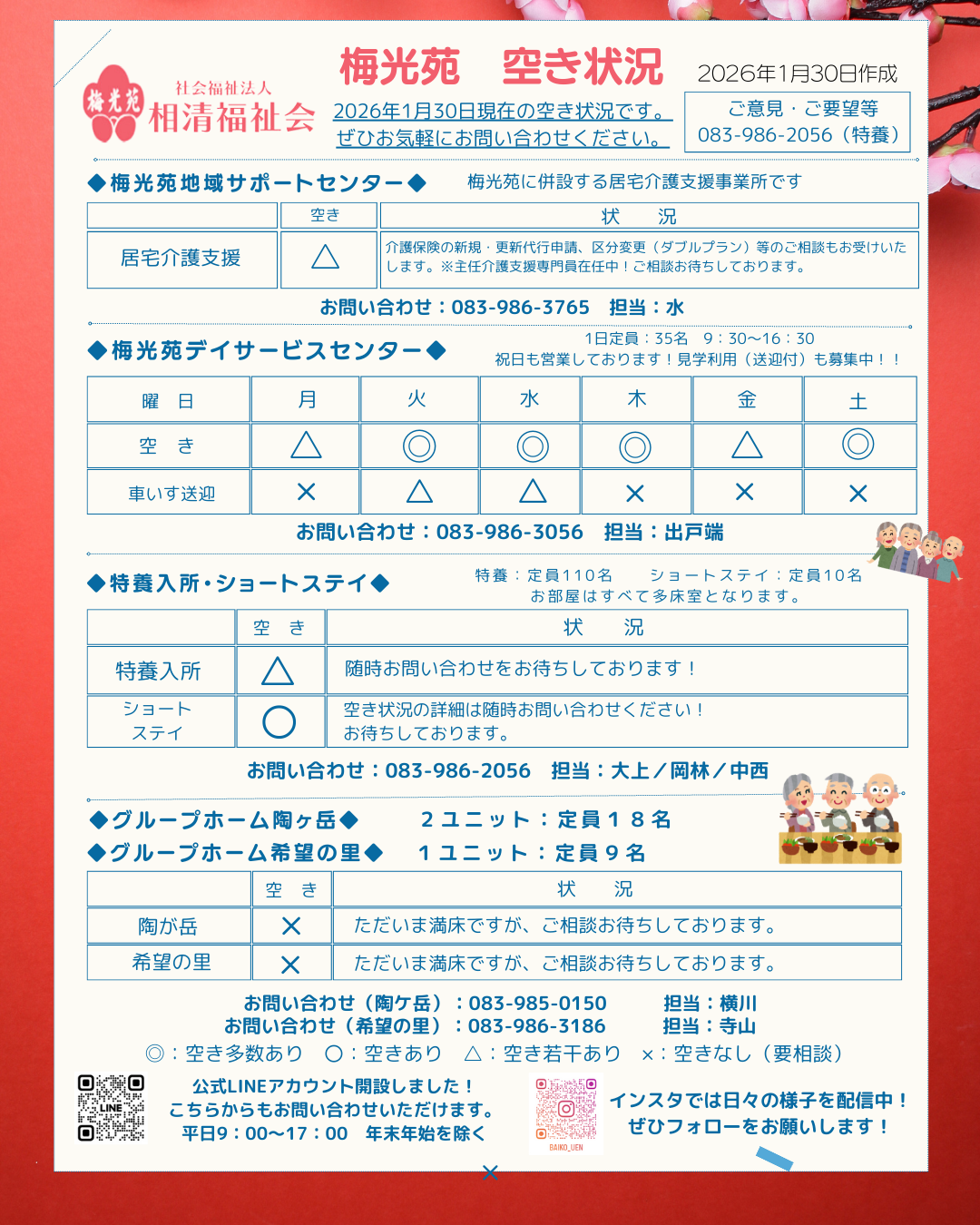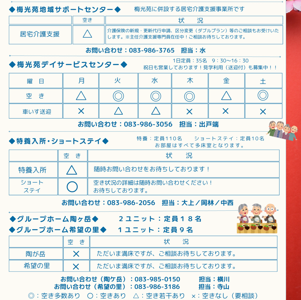特別養護老人ホーム 梅光苑・ショートステイ083-986-2056 担当:大上/岡林/中西